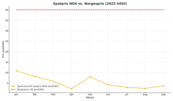Så langt i 2025 har spotprisen i prisområde NO4 (Helgeland og Nord-Norge) i snitt vært 5,6 øre/kWh. Norgespris ligger fast på 40 øre/kWh (uten mva. i Nord-Norge).